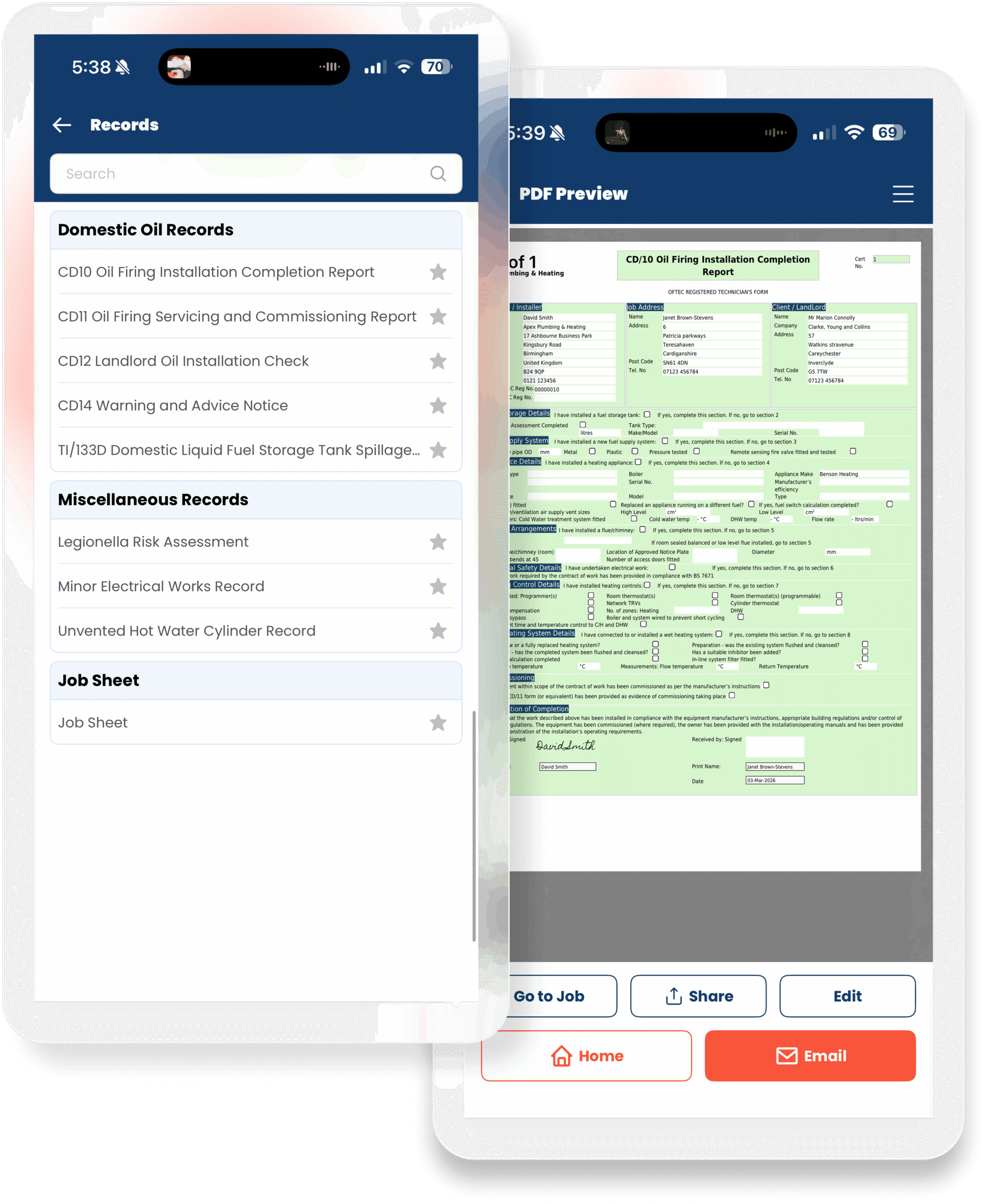 Create, store, and send professional OFTEC oil certificates from your phone or tablet. No paper, no printing, no chasing paperwork at the end of the day.